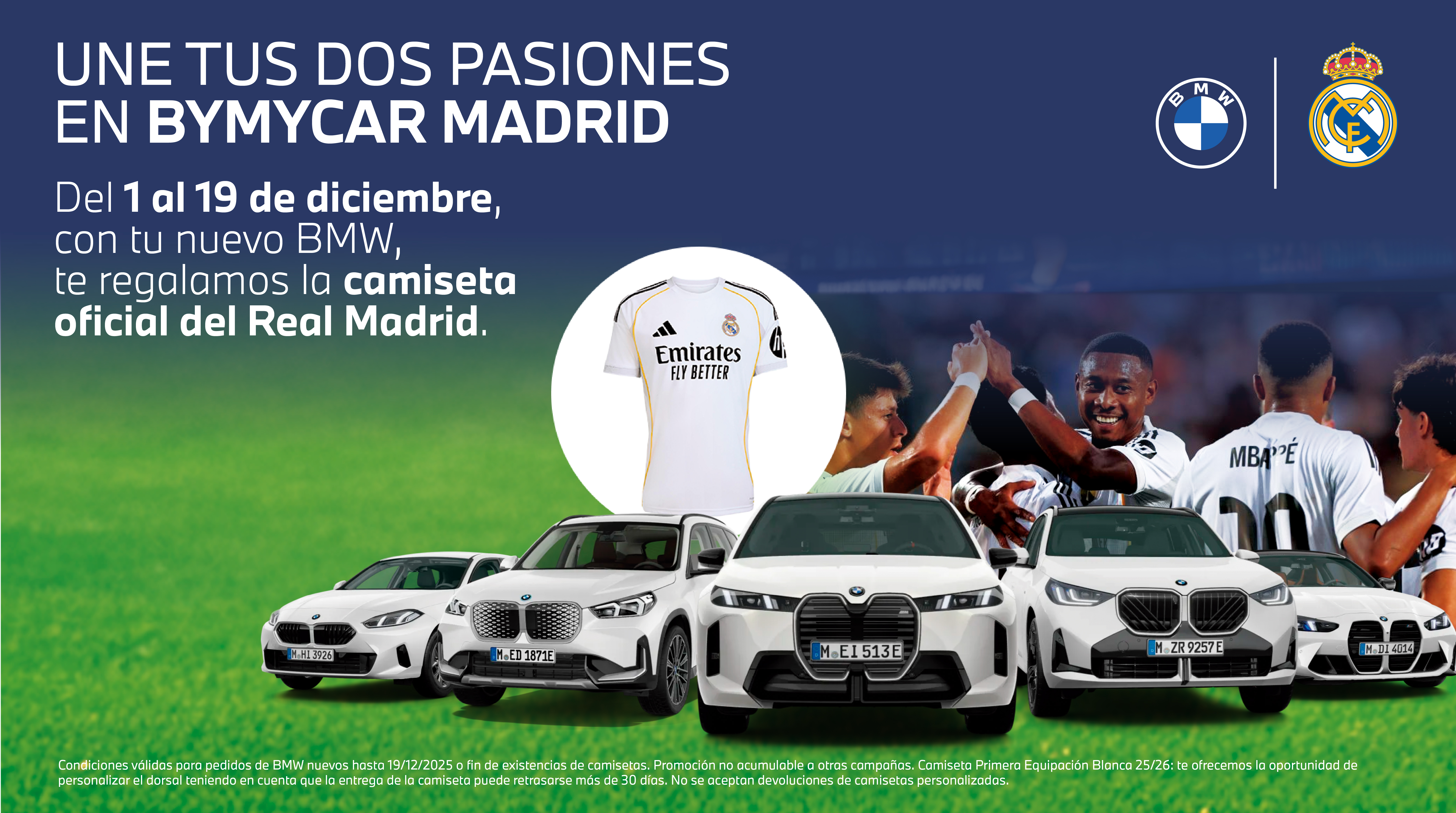Promoción exclusiva de BYmyCAR Madrid. Condiciones válidas para pedidos de BMW nuevos realizados desde el 1/12/2025 hasta 19/12/2025 o fin de existencias de camisetas. Promoción no acumulable a otras campañas. Camiseta Primera Equipación Blanca 25/26: te ofrecemos la oportunidad de personalizar el dorsal teniendo en cuenta que la entrega de la camiseta puede retrasarse más de 30 días. No se aceptan devoluciones de camisetas personalizadas.