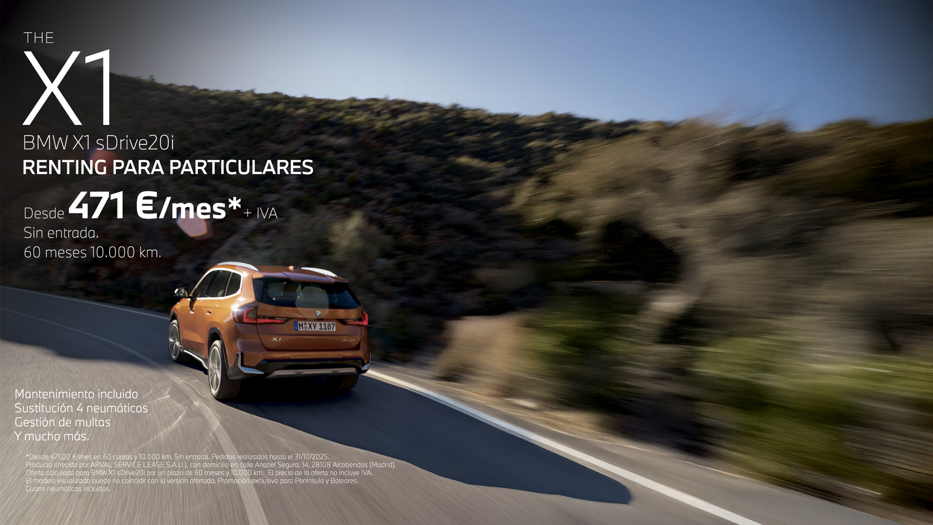 *Desde 471,00 €/mes en 60 cuotas y 10.000 km. Sin entrada. Pedidos realizados hasta el 31/10/2025. Producto ofrecido por ARVAL SERVICE LEASE S.A.U.), con domicilio en calle Anabel Segura, 14, 28108 Alcobendas (Madrid). Oferta calculada para BMW X1 sDrive20i por un plazo de 60 meses y 10.000 km. El precio de la oferta no incluye IVA. El modelo visualizado puede no coincidir con la versión ofertada. Promoción exclusiva para Península y Baleares. Cuatro neumáticos incluidos.