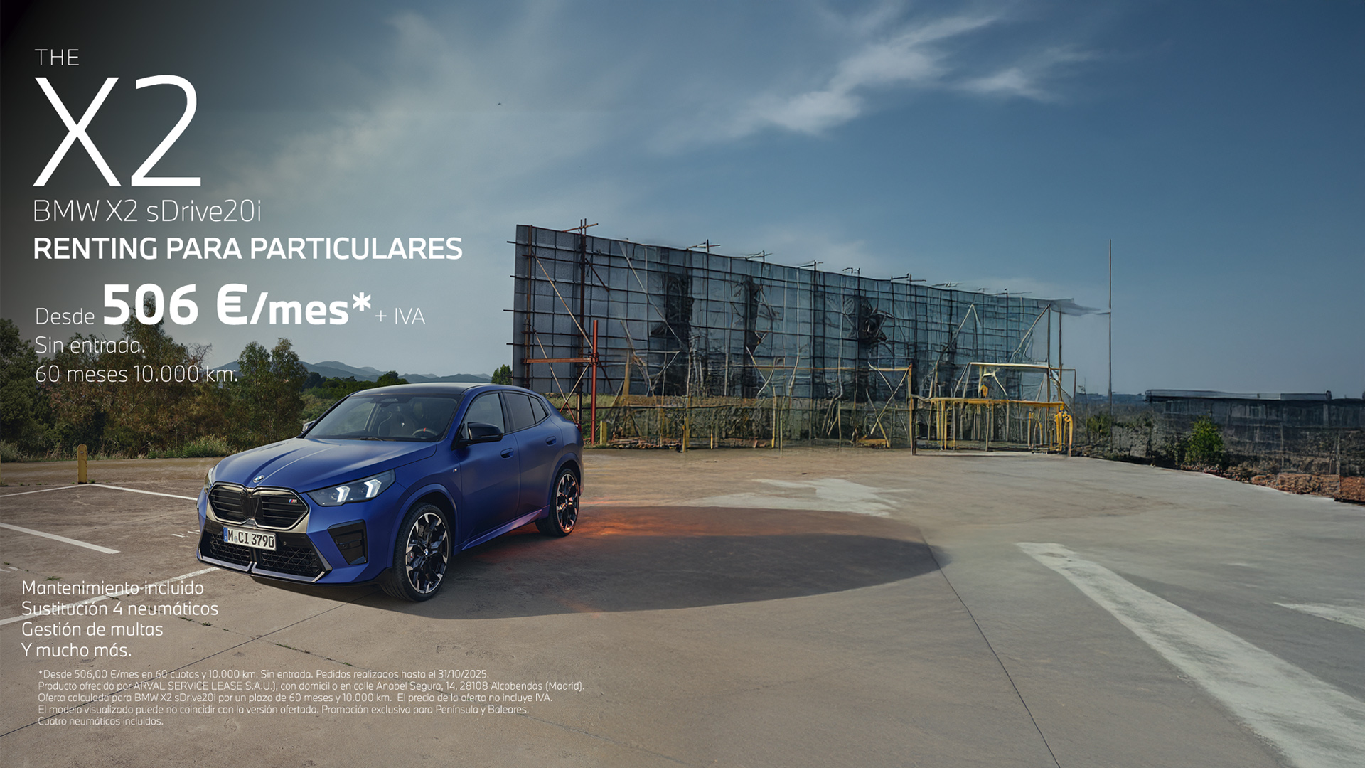 El BMW X2: un SUV que ofrece el equilibrio perfecto entre exclusividad, prestaciones y versatilidad. Descubre su diseño distintivo, caracterizado por líneas poderosas y una presencia atlética. Sumérgete en un interior que exhibe equipamiento exclusivo, tecnología innovadora y confort ergonómico. *Desde 506,00 €/mes en 60 cuotas y 10.000 km. Sin entrada. Pedidos realizados hasta el 31/10/2025. Producto ofrecido por ARVAL SERVICE LEASE S.A.U.), con domicilio en calle Anabel Segura, 14, 28108 Alcobendas (Madrid). Oferta calculada para BMW X2 sDrive20i por un plazo de 60 meses y 10.000 km. El precio de la oferta no incluye IVA. El modelo visualizado puede no coincidir con la versión ofertada. Promoción exclusiva para Península y Baleares. Cuatro neumáticos incluidos.