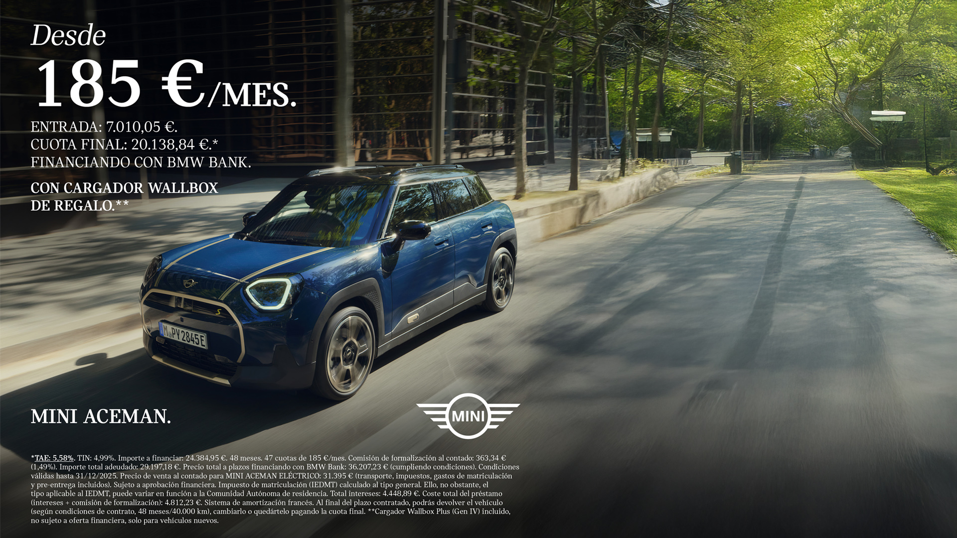 MINI Aceman Eléctrico: *TAE: 5,58%. TIN: 4,99%. Importe a financiar: 24.384,95 €. 48 meses. 47 cuotas de 185 €/mes. Comisión de formalización al contado: 363,34 € (1,49%). Importe total adeudado: 29.197,18 €. Precio total a plazos financiando con BMW Bank: 36.322,23 € (cumpliendo condiciones). Condiciones válidas hasta 31/12/2025. Precio de venta al contado para MINI ACEMAN ELÉCTRICO: 31.510 € (transporte, impuestos, gastos de matriculación y pre-entrega incluidos). Sujeto a aprobación financiera. Impuesto de matriculación (IEDMT) calculado al tipo general. Ello, no obstante, el tipo aplicable al IEDMT, puede variar en función a la Comunidad Autónoma de residencia. Total intereses: 4.448,89 €. Coste total del préstamo (intereses + comisión de formalización): 4.812,23 €. Sistema de amortización francés. Al final del plazo contratado, podrás devolver el vehículo (según condiciones de contrato, 48 meses/40.000 km), cambiarlo o quedártelo pagando la cuota final. Cargador Wallbox Plus (Gen IV) incluido, no sujeto a oferta financiera, sólo para vehículos nuevos. Consumo eléctrico (WLTP combinado): 14.1 – 14.7 Emisiones de CO2 (WLTP combinado): 0 g/km. Autonomía eléctrica (WLTP combinado): 309 – 405.