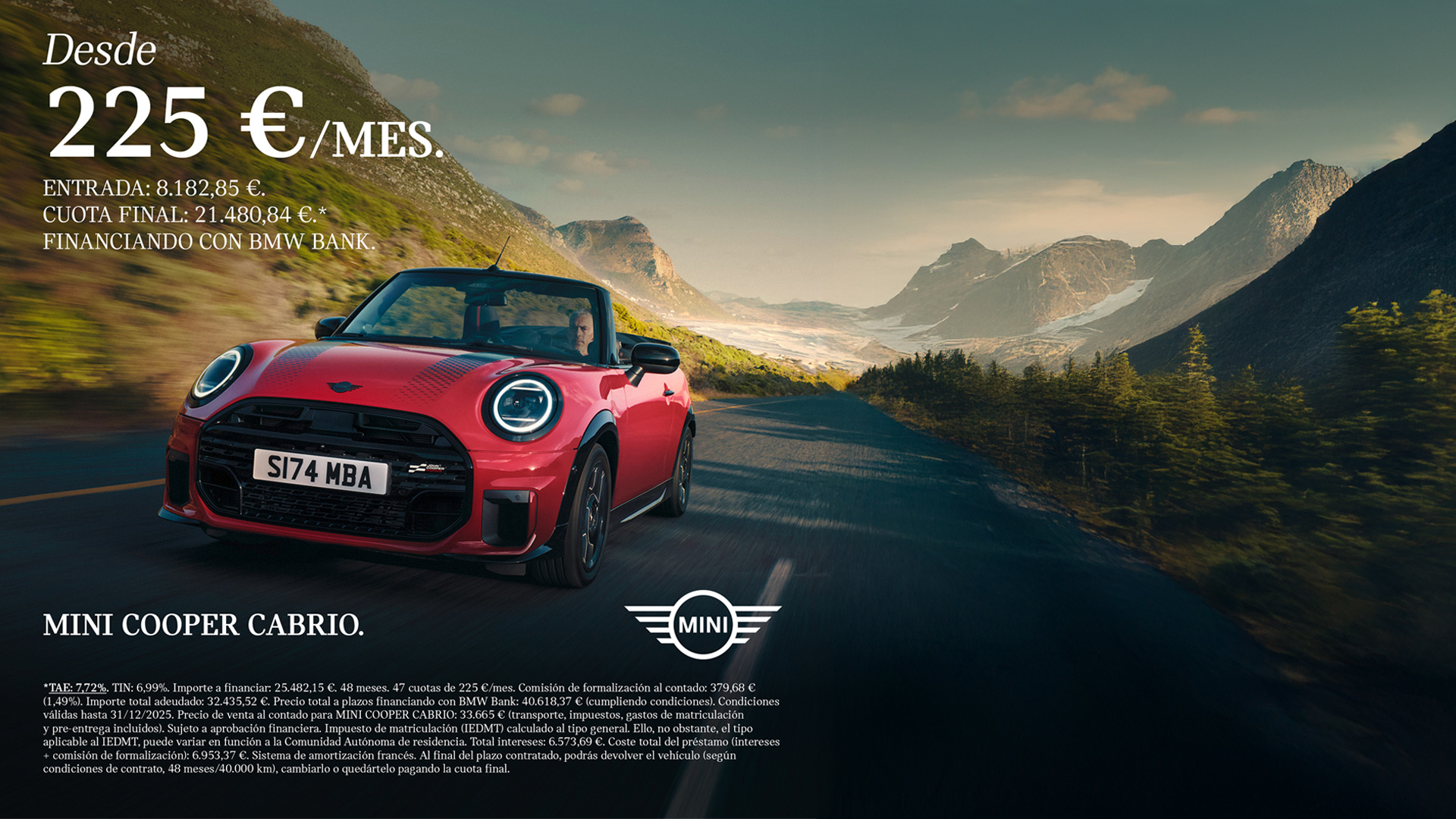 *TAE: 7,72%. TIN: 6,99%. Importe a financiar: 25.482,15 €. 48 meses. 47 cuotas de 225 €/mes. Comisión de formalización al contado: 379,68 € (1,49%). Importe total adeudado: 32.435,52 €. Precio total a plazos financiando con BMW Bank: 40.633,37 € (cumpliendo condiciones). Condiciones válidas hasta 31/12/2025. Precio de venta al contado para MINI COOPER CABRIO: 33.680 € (transporte, impuestos, gastos de matriculación y pre-entrega incluidos). Sujeto a aprobación financiera. Impuesto de matriculación (IEDMT) calculado al tipo general. Ello, no obstante, el tipo aplicable al IEDMT, puede variar en función a la Comunidad Autónoma de residencia. Total intereses: 6.573,69 €. Coste total del préstamo (intereses + comisión de formalización): 6.953,37 €. Sistema de amortización francés. Al final del plazo contratado, podrás devolver el vehículo (según condiciones de contrato, 48 meses/40.000 km), cambiarlo o quedártelo pagando la cuota final. Consumo de combustible (WLTP combinado): 6.5 – 7.1 l/100 km. Emisiones de CO2 (WLTP combinado): 147 - 161 g/km.
