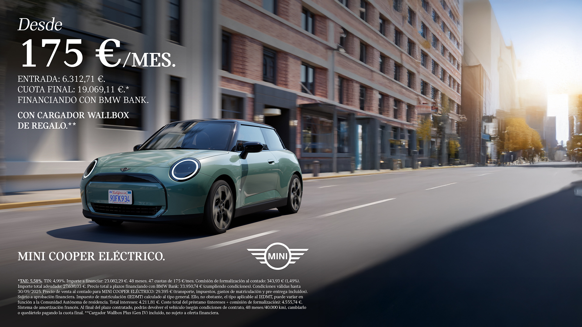 *TAE: 5,58%. TIN: 4,99%. Importe a financiar: 23.082,29 €. 48 meses. 47 cuotas de 175 €/mes. Comisión de formalización al contado: 343,93 € (1,49%). Importe total adeudado: 27.638,03 €. Precio total a plazos financiando con BMW Bank: 33.950,74 € (cumpliendo condiciones). Condiciones válidas hasta 30/09/2025. Precio de venta al contado para MINI COOPER ELÉCTRICO: 29.395 €."(transporte, impuestos, gastos de matriculación y pre-entrega incluidos). Sujeto a aprobación financiera. Impuesto de matriculación (IEDMT) calculado al tipo general. Ello, no obstante, el tipo aplicable al IEDMT, puede variar en función a la Comunidad Autónoma de residencia. Total intereses: 4.211,81 €. Coste total del préstamo (intereses + comisión de formalización): 4.555,74 €. Sistema de amortización francés. Al final del plazo contratado, podrás devolver el vehículo (según condiciones de contrato, 48 meses/40.000 km), cambiarlo o quedártelo pagando la cuota final. Cargador Wallbox Plus (Gen IV) incluido, no sujeto a oferta financiera. Consumo eléctrico (WLTP combinado): 13.8 - 14.7. kWh/100km. Emisiones de CO2 (WLTP combinado): 0 g/km. Autonomía eléctrica (WLTP combinado): 300 – 400.