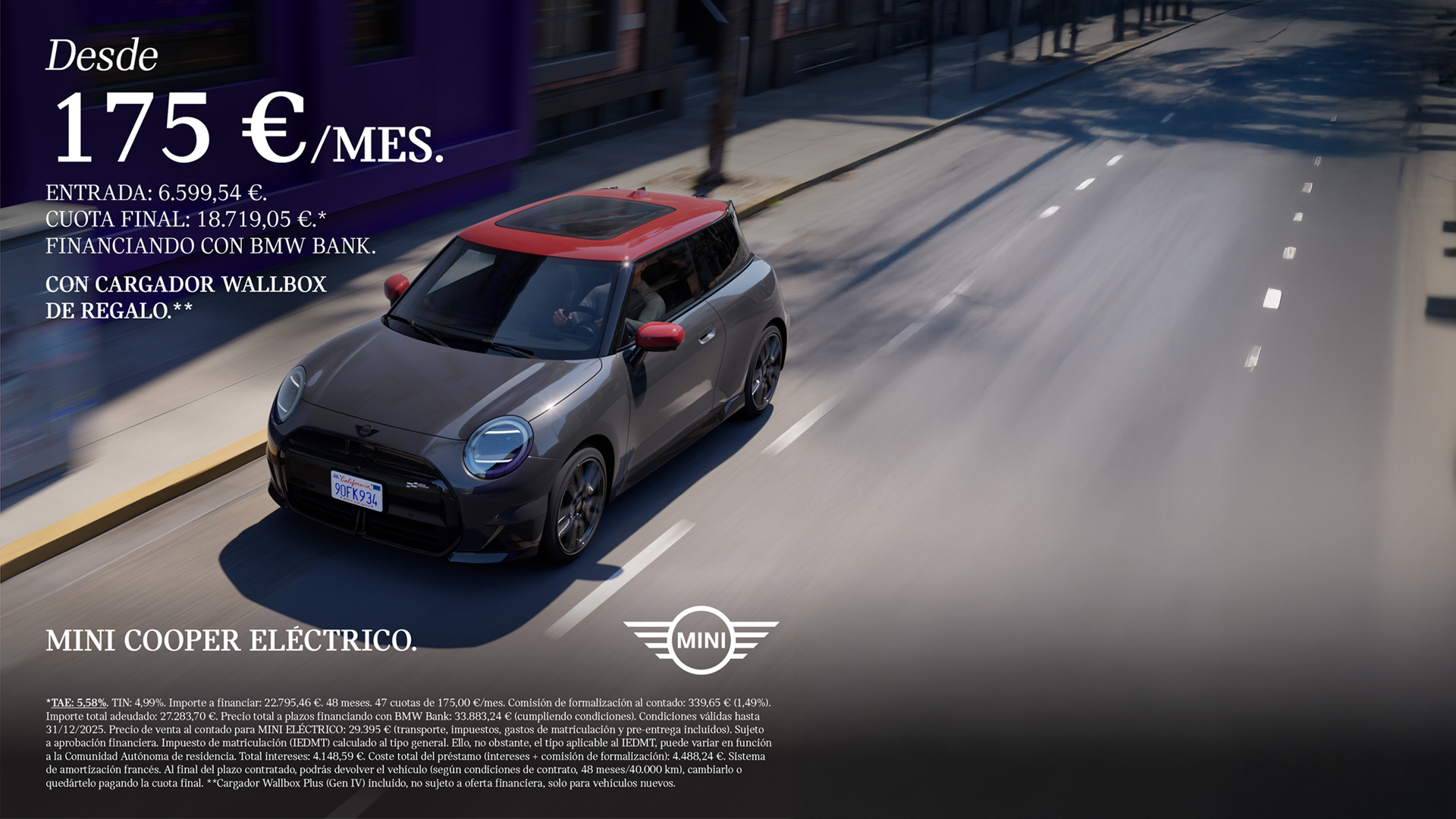*TAE: 5,58%. TIN: 4,99%. Importe a financiar: 22.795,46 €. 48 meses. 47 cuotas de 175 €/mes. Comisión de formalización al contado: 339,65 € (1,49%). Importe total adeudado: 27.283,70 €. Precio total a plazos financiando con BMW Bank: 33.998,24 € (cumpliendo condiciones). Condiciones válidas hasta 31/12/2025. Precio de venta al contado para MINI ELÉCTRICO: 29.510 € (transporte, impuestos, gastos de matriculación y pre-entrega incluidos). Sujeto a aprobación financiera. Impuesto de matriculación (IEDMT) calculado al tipo general. Ello, no obstante, el tipo aplicable al IEDMT, puede variar en función a la Comunidad Autónoma de residencia. Total intereses: 4.148,59 €. Coste total del préstamo (intereses + comisión de formalización): 4.488,24 €. Sistema de amortización francés. Al final del plazo contratado, podrás devolver el vehículo (según condiciones de contrato, 48 meses/40.000 km), cambiarlo o quedártelo pagando la cuota final. Cargador Wallbox Plus (Gen IV) incluido, no sujeto a oferta financiera, sólo para vehículos nuevos. Consumo eléctrico (WLTP combinado): 13.8 - 14.7. kWh/100km. Emisiones de CO2 (WLTP combinado): 0 g/km. Autonomía eléctrica (WLTP combinado): 300 – 400