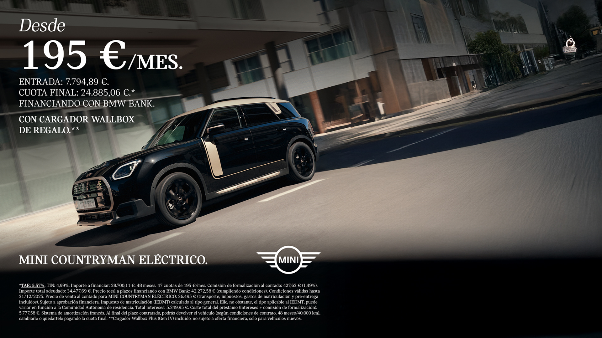 *TAE: 5,57%. TIN: 4,99%. Importe a financiar: 28.700,11 €. 48 meses. 47 cuotas de 195 €/mes. Comisión de formalización al contado: 427,63 € (1,49%). Importe total adeudado: 34.477,69 €. Precio total a plazos financiando con BMW Bank: 42.387,58 € (cumpliendo condiciones). Condiciones válidas hasta 31/12/2025. Precio de venta al contado para MINI COUNTRYMAN ELÉCTRICO: 36.610 € (transporte, impuestos, gastos de matriculación y pre-entrega incluidos). Sujeto a aprobación financiera. Impuesto de matriculación (IEDMT) calculado al tipo general. Ello, no obstante, el tipo aplicable al IEDMT, puede variar en función a la Comunidad Autónoma de residencia. Total intereses: 5.349,95 €. Coste total del préstamo (intereses + comisión de formalización): 5.777,58 €. Sistema de amortización francés. Al final del plazo contratado, podrás devolver el vehículo (según condiciones de contrato, 48 meses/40.000 km), cambiarlo o quedártelo pagando la cuota final. Cargador Wallbox Plus (Gen IV) incluido, no sujeto a oferta financiera, sólo para vehículos nuevos. Consumo eléctrico (WLTP combinado): 15.7 - 18.5. Emisiones de CO2 (WLTP combinado): 0 g/km. Autonomía eléctrica (WLTP combinado): 432 – 463.
