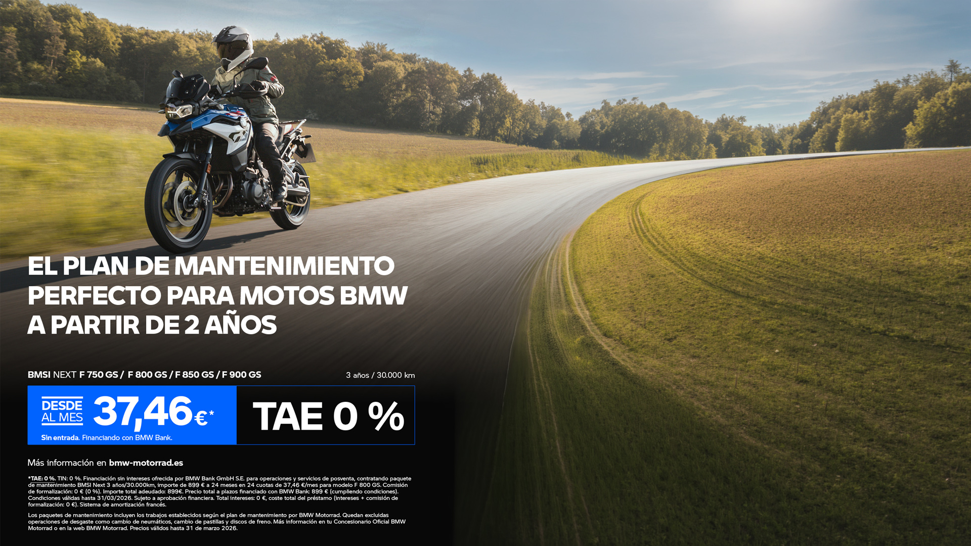BMSI Next es el plan de mantenimiento diseñado para los propietarios de una BMW F 750 GS, F 800 GS, F 850 GS o F 900 GS con más de 2 años de antigüedad desde su primera fecha de matriculación. Este paquete ofrece una tranquilidad total durante 3 años o 30.000 km, permitiéndote realizar todos los trabajos de mantenimiento oficiales establecidos por BMW Motorrad.