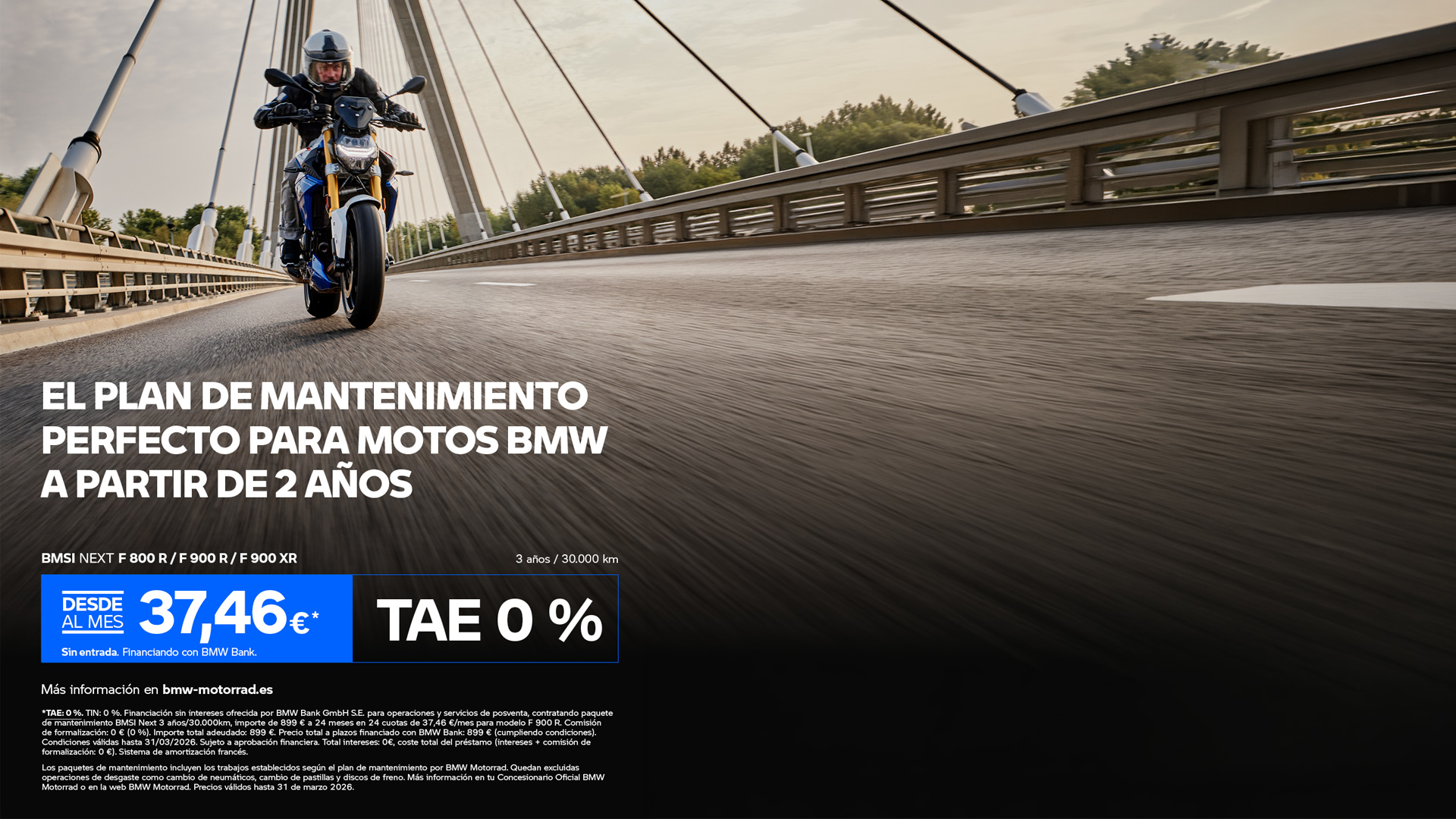 BMSI Next es el plan de mantenimiento diseñado para los propietarios de una BMW F 800 R, F 900 R o F 900 XR con más de 2 años de antigüedad desde su primera fecha de matriculación. Este paquete ofrece una tranquilidad total durante 3 años o 30.000 km, permitiéndote realizar todos los trabajos de mantenimiento oficiales establecidos por BMW Motorrad.
