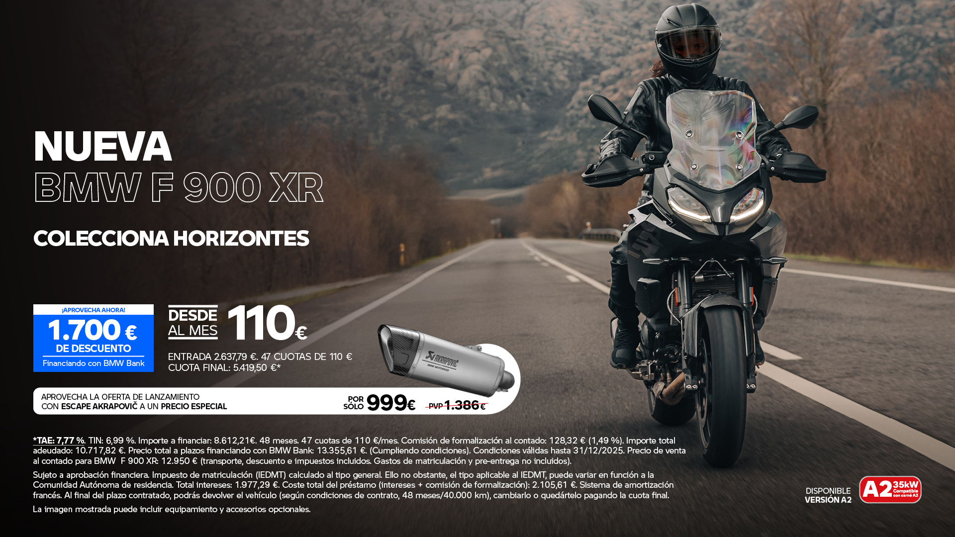 *TAE: 7,77%. TIN: 6,99%. Importe a financiar: 8.612,21€. 48 meses. 47 cuotas de 110 €/mes. Comisión de formalización al contado: 128,32€, 1,49%" Importe total adeudado: 10.717,82 €. Precio total a plazos financiando con BMW Bank: 13.355,61 €. (Cumpliendo condiciones). Condiciones válidas hasta 31/12/2025. Precio de venta al contado para BMW F 900 XR: 12.950 €." (transporte, descuento e impuestos incluidos; Gastos de matriculación y pre-entrega no incluidos).
