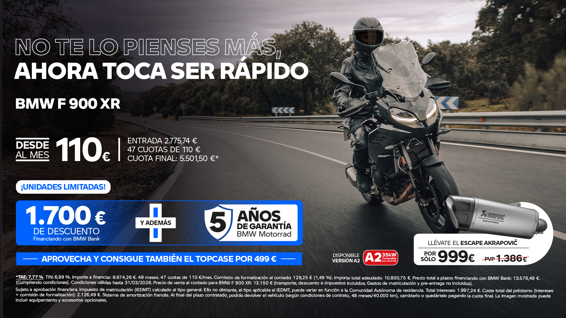 *TAE: 7,77%. TIN: 6,99%. Importe a financiar: 8.674,26€. 48 meses. 47 cuotas de 110 €/mes. Comisión de formalización al contado: 129,25€,1,49%" Importe total adeudado: 10.800,75 €. Precio total a plazos financiando con BMW Bank: 13.576,49 €.(Cumpliendo condiciones). Condiciones válidas hasta 31/03/2026. Precio de venta al contado para BMW F 900 XR: 13.150,00 €."(transporte, descuento e impuestos incluidos; Gastos de matriculación y pre-entrega no incluidos).