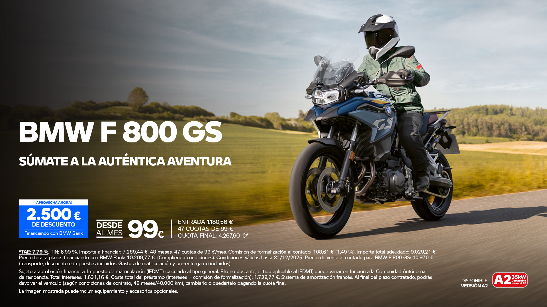 *TAE: 7,79%. Importe a financiar: 7.289,44€. 48 meses. 47 cuotas de 99 €/mes. Comisión de formalización al contado: 108,61€, 1,49%" Importe total adeudado: 9.029,21 €. Precio total a plazos financiando con BMW Bank: 10.209,77 €. (Cumpliendo condiciones). Condiciones válidas hasta 31/12/2025. Precio de venta al contado para BMW F 800 GS: 10.970 €." (transporte, descuento e impuestos incluidos; Gastos de matriculación y pre-entrega no incluidos).