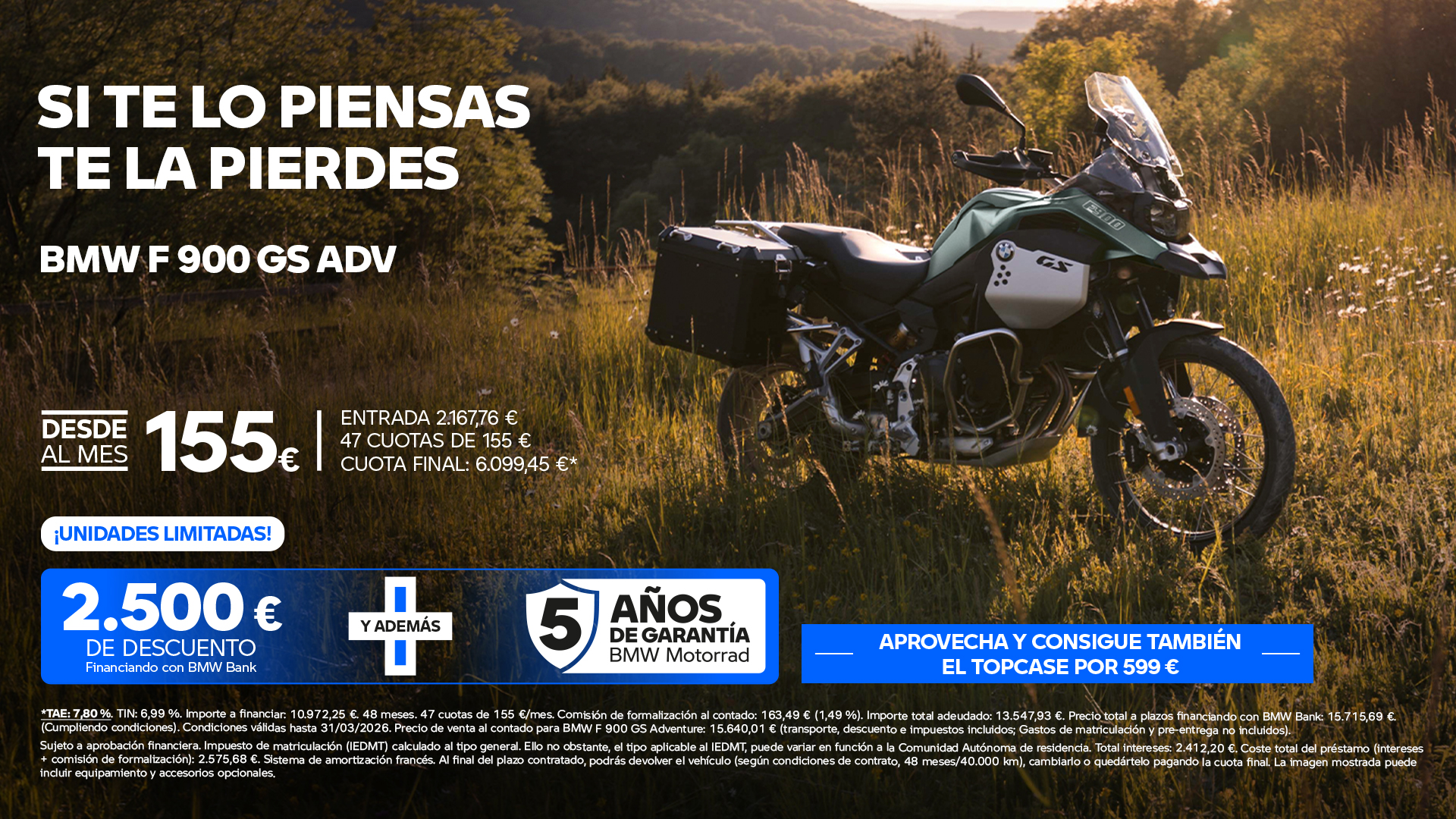 *TAE: 7,80 %. TIN: 6,99%. Importe a financiar: 10.972,25€. 48 meses. 47 cuotas de 155,00 €/mes. Comisión de formalización al contado: 163,49€,1,49%" Importe total adeudado: 13.547,93 €. Precio total a plazos financiando con BMW Bank: 15.715,69 €.(Cumpliendo condiciones). Condiciones válidas hasta 31/03/2026. Precio de venta al contado para BMW F 900 GS Adventure: 15.640,01 €."(transporte, descuento e impuestos incluidos; Gastos de matriculación y pre-entrega no incluidos).