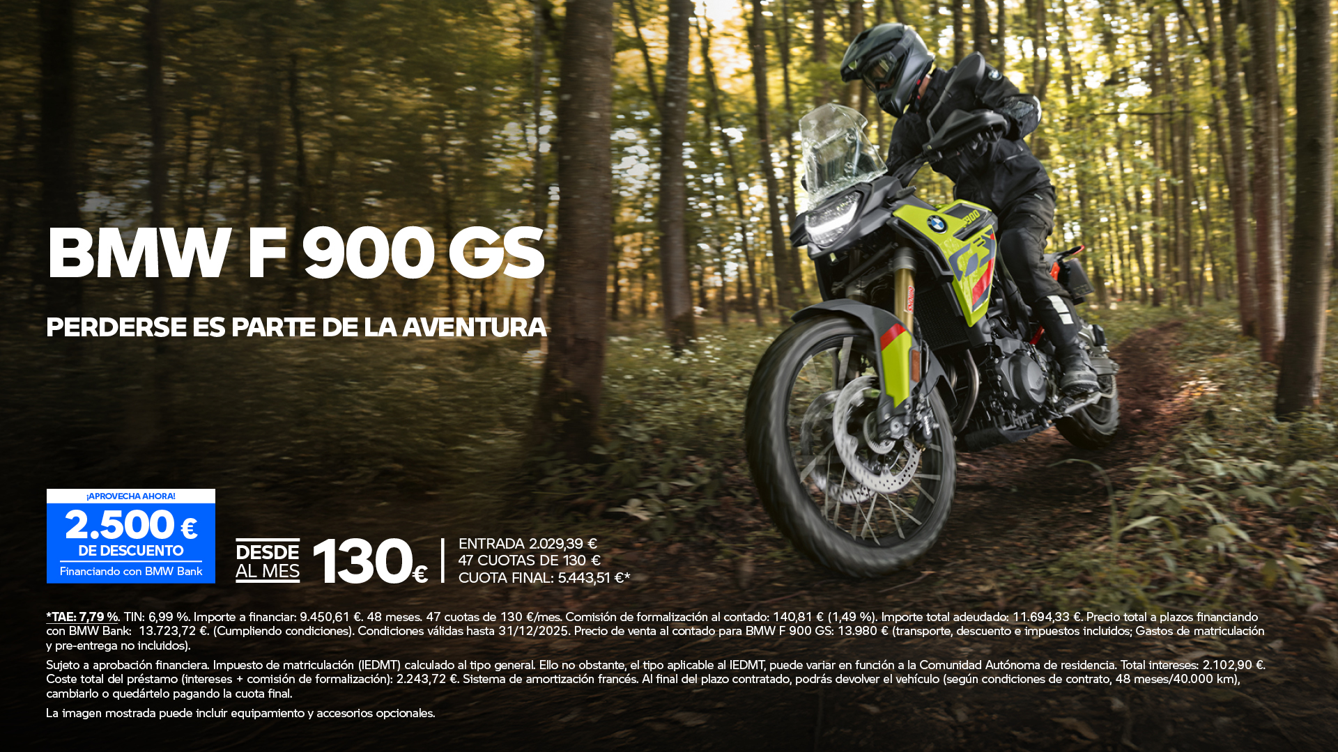*TAE: 7,79%. TIN: 6,99%. Importe a financiar: 9.450,61€. 48 meses. 47 cuotas de 130 €/mes. Comisión de formalización al contado: 140,81€, 1,49%" Importe total adeudado: 11.694,33 €. Precio total a plazos financiando con BMW Bank: 13.723,72 €. (Cumpliendo condiciones). Condiciones válidas hasta 31/12/2025. Precio de venta al contado para BMW F 900 GS: 13.980 €." (transporte, descuento e impuestos incluidos; Gastos de matriculación y pre-entrega no incluidos).