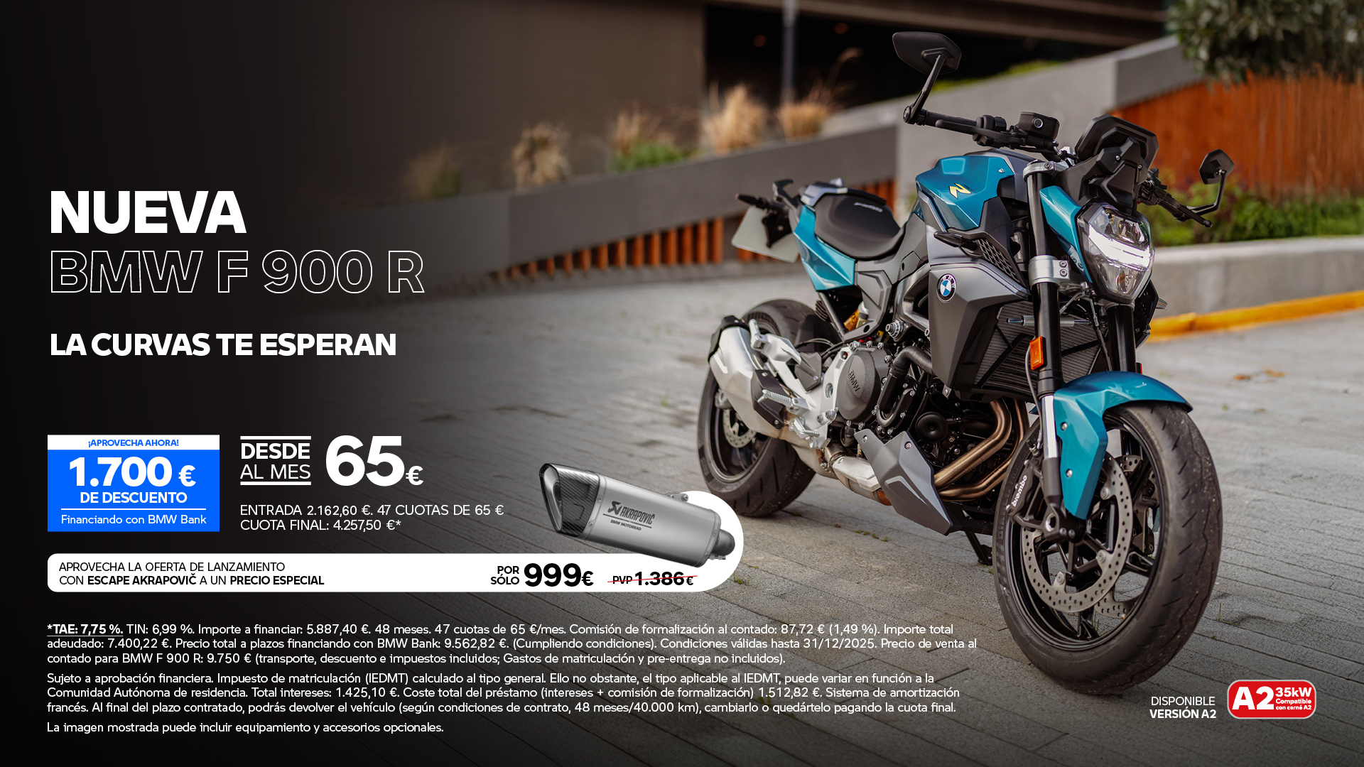 *TAE: 7,75%. TIN: 6,99%. Importe a financiar: 5.887,40€. 48 meses. 47 cuotas de 65 €/mes. Comisión de formalización al contado: 87,72€,1,49%" Importe total adeudado: 7.400,22 €. Precio total a plazos financiando con BMW Bank: 9.562,82 €. (Cumpliendo condiciones). Condiciones válidas hasta 31/12/2025. Precio de venta al contado para BMW F 900 R: 9.750 €." (transporte, descuento e impuestos incluidos; Gastos de matriculación y pre-entrega no incluidos).